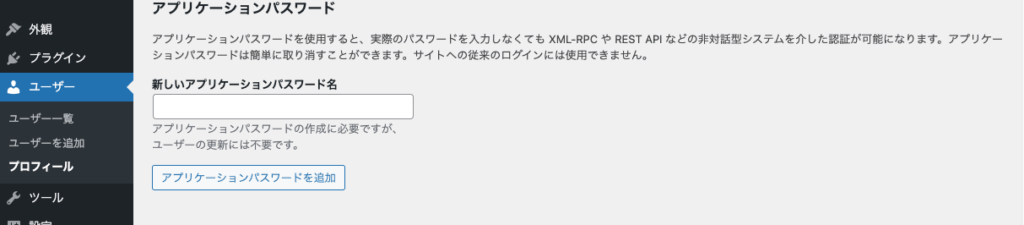 ワードプレス>ユーザー>アプリケーションパスワードを追加